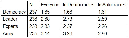 Democracy is rated far above other regimes everywhere. What I find surprising is that these postures are not endogenous. People living in autocracies rate all regimes as better than those living in democracies and, while the differences are statistically significant, they are numerically tiny. This contradicts my prior beliefs: I always thought that people approve of the regimes they live under. I expected that while people living in democracies would score it well, people living in autocracies led by powerful leaders would rate them better than democracy.