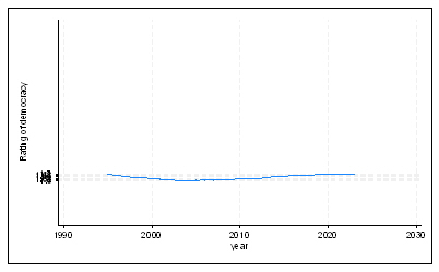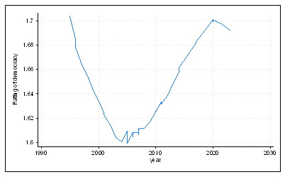 The reason I decided to plunge into this topic is to dispel some attention grabbing headlines. Here is a graph of ratings of democracy in the range in which they are observed. It shows that evaluations of democracy plummeted after 2008. Hence, “a crisis of democracy.”