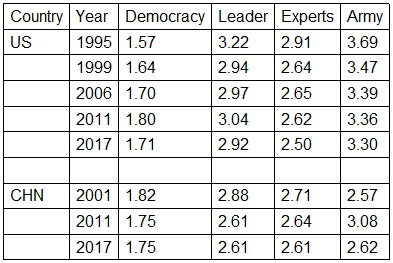 Here are the ratings of regimes by people living in the US and in China (remember lower score is better):